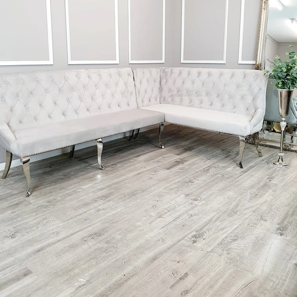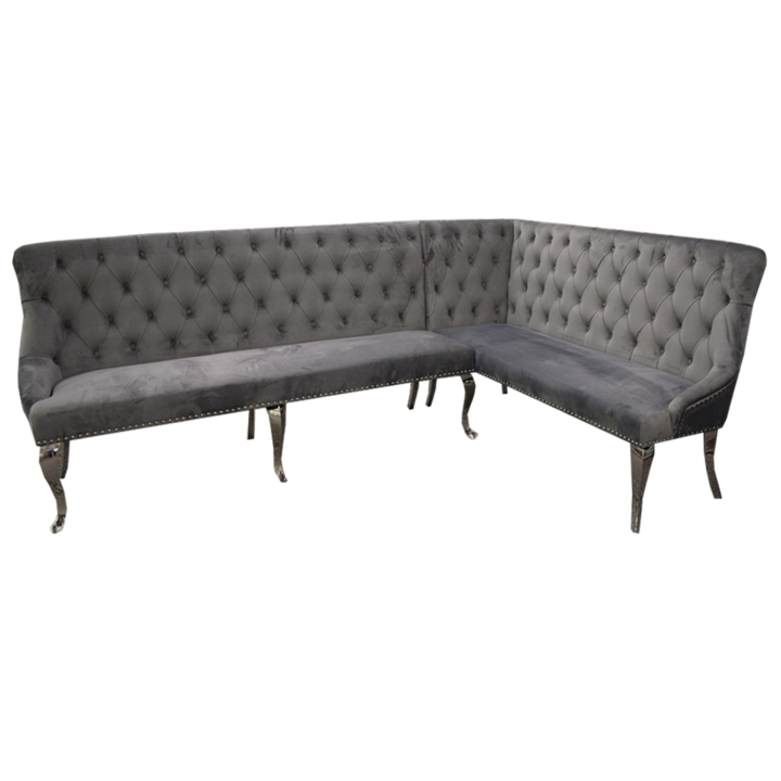 Our Louis corner bench is a deep padded upholstered corner bench with cushioned backrest. This elegant bench offers comfort and style boasting a quilted seat enhanced with chrome buttons around the edge whilst positioned on ten stainless steel curved legs. This bench is currently available in Dark Grey or Pink Velvet in 2 sizes, 1.7 and 1.8.